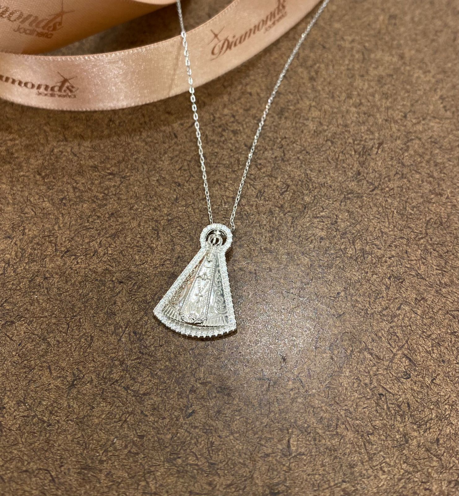 COLAR NOSSA SENHORA APARECIDA EM PRATA 925 E RÓDIO BRANCO.